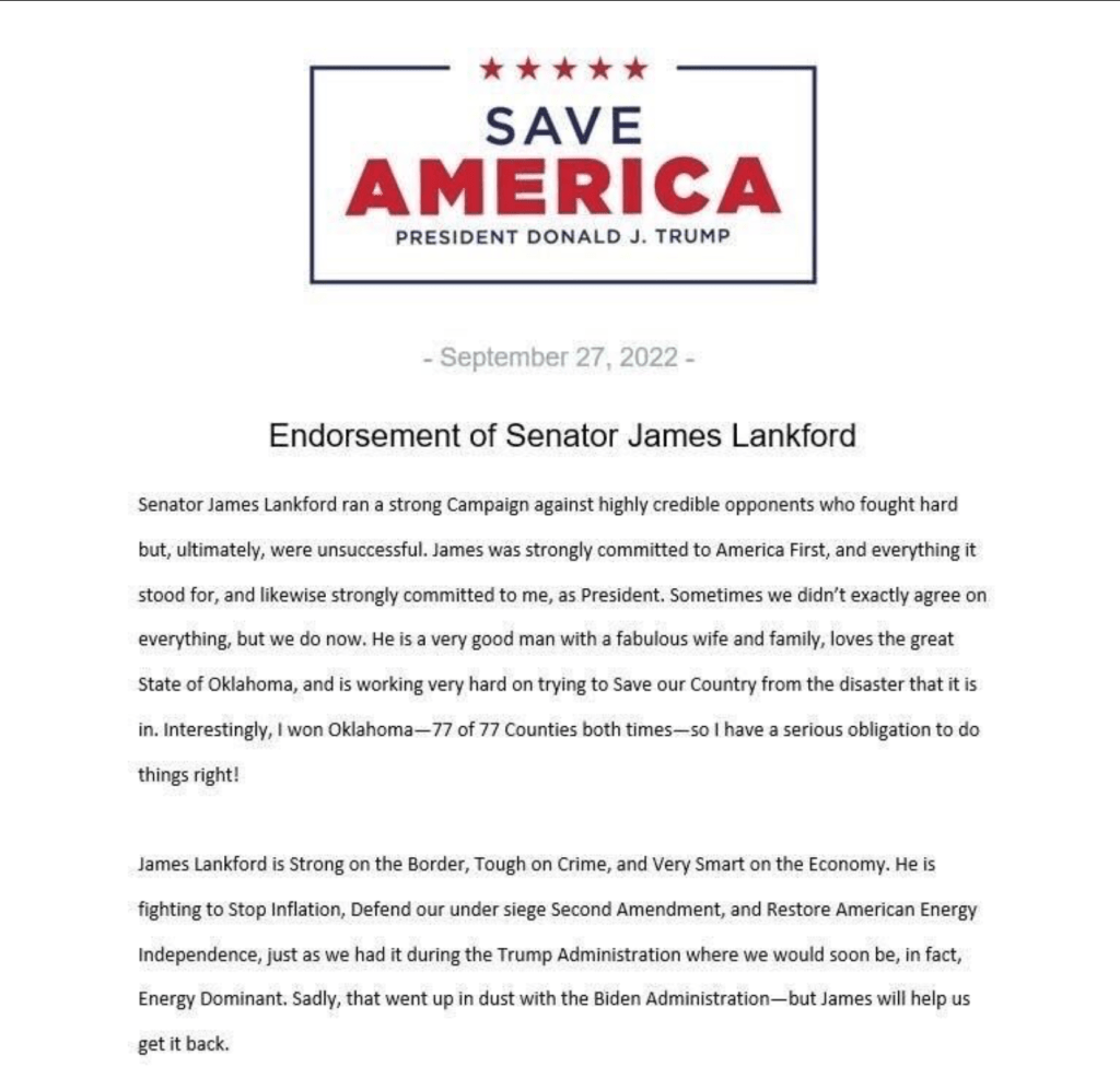 Trump: “Just to correct the record, I did not endorse Senator Lankford. I didn’t do it.”