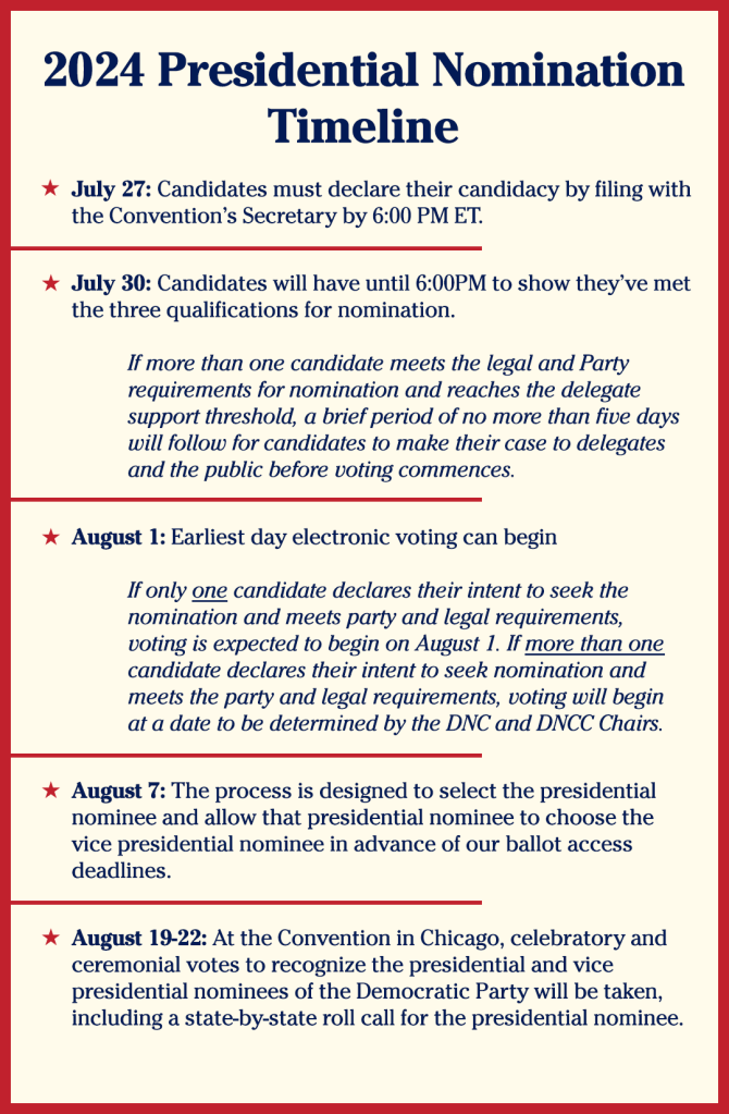 - Declaración de intención del candidato: Los candidatos que deseen postularse para la nominación deben declarar su intención antes del 27 de julio a las 6:00 p. m., hora del este, al Secretario de la Convención y deben incluir una copia no certificada pero firmada del Apéndice E de la Convocatoria para la Convención Nacional Demócrata de 2024 como así como enlaces al sitio web del candidato y dirección de correo electrónico de contacto para ser incluidos en el Directorio de Candidatos. El Apéndice E requiere que el candidato confirme que es miembro del Partido Demócrata y que se postulará y servirá como demócrata, si es elegido.