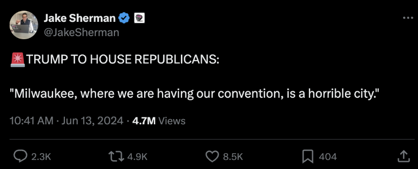 Ben Wikler, WI Democratic Party Chair: “The GOP wants to enjoy Milwaukee’s hospitality while they host their convicted felon wannabe dictator coronation party—but behind closed doors, Trump and his DC cronies are insulting Milwaukee while they plot to suppress Milwaukeeans’ votes & rip away their freedoms. Fight back.”
