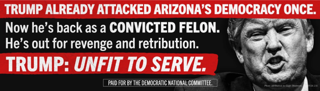 “The billboard, paid for by the DNC, says ‘Trump already attacked Arizona’s democracy once. Now he’s back as a convicted felon. He’s out for revenge and retribution. Trump: unfit to serve.’”