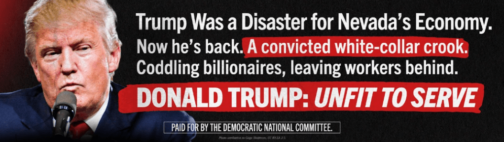 MSNBC: “…While Trump avoided referencing his conviction in Las Vegas, Democrats didn’t. The DNC installed a billboard near the rally location that said, ‘Trump was a disaster for Nevada’s economy. Now he’s back.’ They called him ‘a convicted white-collar crook’ who was ‘unfit to serve.’”